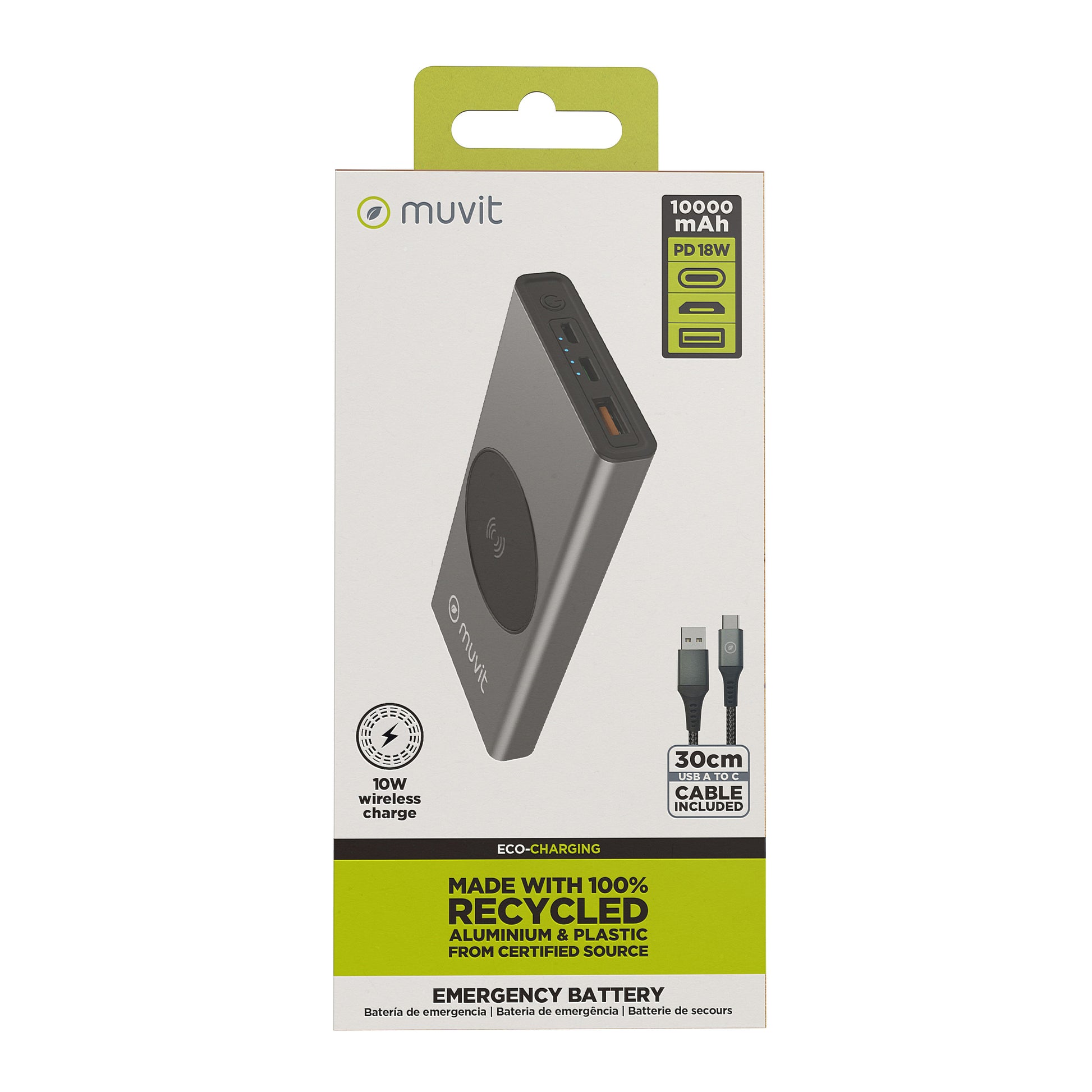 Charge multiple devices with this 10000mAh wireless battery. Includes USB A and Type C outputs and is made from sustainable materials.